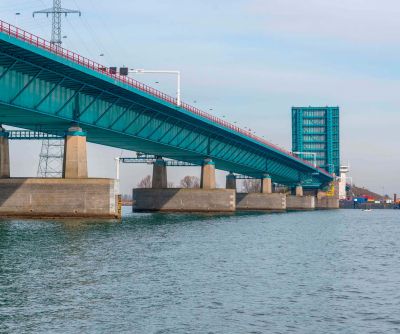 Tekst: L'ancien pont levant entre Wormer en Wormerveer au nord d'Amsterdam, a été entièrement démoli et remplacé par un nouveau pont en acier avec des approches en béton. Grâce à cette nouvelle conception, la voie navigable a été élargie de 12 à 16,5 m et la hauteur libre de passage a été portée à 2,88 m. Le pont est constitué de deux tours de 15x3 m (22 tonnes chacune), un tablier mobile de 23x10 m (95 tonnes), deux tabliers mobiles pour la circulation lente de 21x7 m (35 tonnes chacun), un balancier de 25x11 m (345 tonnes, dont 88 tonnes de ballast de réglage) et un système d'entraînement central avec des roues Panama dans le sous-sol du pont. Le tout en S355 et classe de suivi CC2. La complexité du nouveau pont réside principalement dans sa silhouette élancée. Le pont dispose de deux parties séparées pour les cyclistes et les piétons, avec à la fois un arc et une courbe en S. Les tours de levage et le balancier sont également dotés de bords et d'angles arrondis (r = 100 mm). La hauteur de construction des travées était limitée en raison du profil de l'espace libre - en dessous et au-dessus, ce qui classe le pont dans la catégorie 'très élancé'. C'est pourquoi, en raison d'un rapport de centre de gravité défavorable, il a été décidé d'utiliser un remplissage combiné en acier et en béton lourd dans le contrepoids. Composé de trois parties distinctes, chacune avec ses propres appuis, le pont compte au total huit axes alignés. La conception structurelle et électrique a également pris en compte la possibilité d'une collision : il est possible de détacher le pont cyclable (de le rééquilibrer) et de le rendre pivotant en prenant les mesures appropriées.