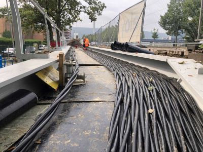 Tekst: Les 2 anciens ouvrages, franchissant la Vesdre à Nasproué et La Raye à Verviers, fortement sinistré par les inondations de 2021, sont remplacés par des nouveaux ouvrages composés de 2 poutres en caisson trapézoïdal à hauteur variable. Le tablier central est une dalle en béton coulée sur prédalles d’une largeur utile de 4 m. Ces 2 ouvrages ont été réalisés dans un marché unique de par leur analogie de conception et de dimensions. Les quartiers desservis par ces ouvrages fortement enclavés nécessitaient un timing de chantier avec coupure du passage limité. La conception de ces ponts entièrement préfabriqués a permis de limiter la période de coupure entre la pose de l’ouvrage et la mise en service à moins d’un mois et demi. La structure en acier possède une portée principale de 21 m et 26 m respectivement, sans pile intermédiaire augmentant ainsi la section hydraulique de la rivière en cas de future crue, pour un poids de 32 et 40 tonnes environ. De plus, tous les impétrants ont été intégré dans le tablier et les caissons structurels d’un part pour une meilleure intégration esthétique de l’ouvrage et d’autre part pour protéger ces réseaux en cas de future crue.