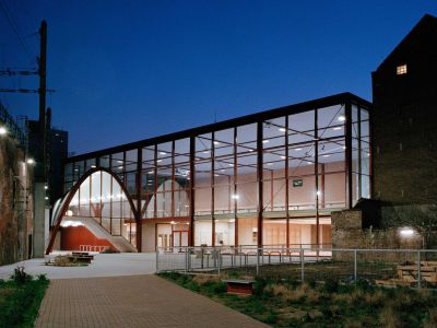Tekst: Le bâtiment classé de la Machine-à-eau est conservé au sein d’un complexe ambitieux autour duquel deux extensions contemporaines complètent le bâtiment historique, l’englobant dans un ensemble porteur de sens de sa nouvelle fonction. L’acier se retrouve dans la passerelle de 16 m de long, une tôle pliée de 10 mm dans l’esprit des origamis, qui caractérise de nombreux éléments de la ferronnerie mais qui imprègne aussi les nouvelles façades qui donnent volontiers l’impression d’une surface pliée plutôt que d’une masse. Le mobilier aussi recourt abondamment à l’acier.