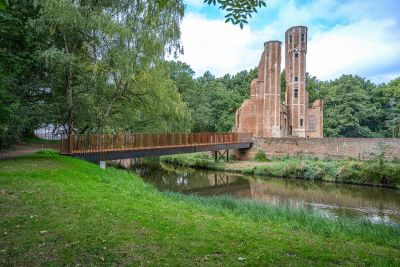 Tekst: Le pont reliant les ruines du château Ter Elst à Duffel a été officiellement inauguré en 2025 par la Fondation Kempens Landschap et la commune de Duffel. Ce nouveau pont piétonnier relie l'île du château au Muggenbergpark et au chemin de halage le long de la Nete, et fait également office de voie d'évacuation sécurisée. L'inauguration marque une étape importante dans la restauration des ruines, qui devrait être entièrement terminée à l'horizon 2026. Le site restauré sera destiné à accueillir des événements, et le nouveau pont viendra renforcer cette fonction en améliorant l'accessibilité. Le pont de 20 m de long est fabriqué en acier auto-patinable. Il a été transporté en une seule pièce et assemblé à l'aide d'une grue de montage.