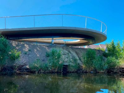 Tekst: Ce pont cyclable asymétrique avec caisson de torsion porteur et tablier en porte-à-faux attire discrètement le regard dans le paysage de polders entre Voorhout et Noordwijk auprès de Leiden (Hollande du Sud). Le pont décrit une courbe prononcée, encadrée à l'intérieur par le caisson de torsion qui s'élève au-dessus du tablier. Les points d'appui intermédiaires sont situés directement sous le caisson de torsion, à l'endroit où les efforts sont les plus importants. La conception structurelle réduit au minimum la différence de hauteur pour les cyclistes, ce qui contribue au confort d'utilisation. Les deux approches diffèrent à presque tous les égards : un remblai d'un côté et une construction dans l'eau de l'autre. C'est là que commence le pont avec une partie plate, qui offre aux cyclistes qui montent de l'espace pour prendre leur élan et à ceux qui descendent de l'espace pour surveiller la route transversale et s'arrêter si nécessaire. En raison de sa forme et de ses dimensions (73 m de long, 4 m de large), son transport a été un véritable défi. Le pont a finalement été transporté en trois parties jusqu'à son emplacement. Les différentes parties ont ensuite été assemblées à l'aide de boulons. Une attention particulière a été accordée à la conception minutieuse des trappes qui rendent les raccords accessibles tout en les dissimulant à la vue.