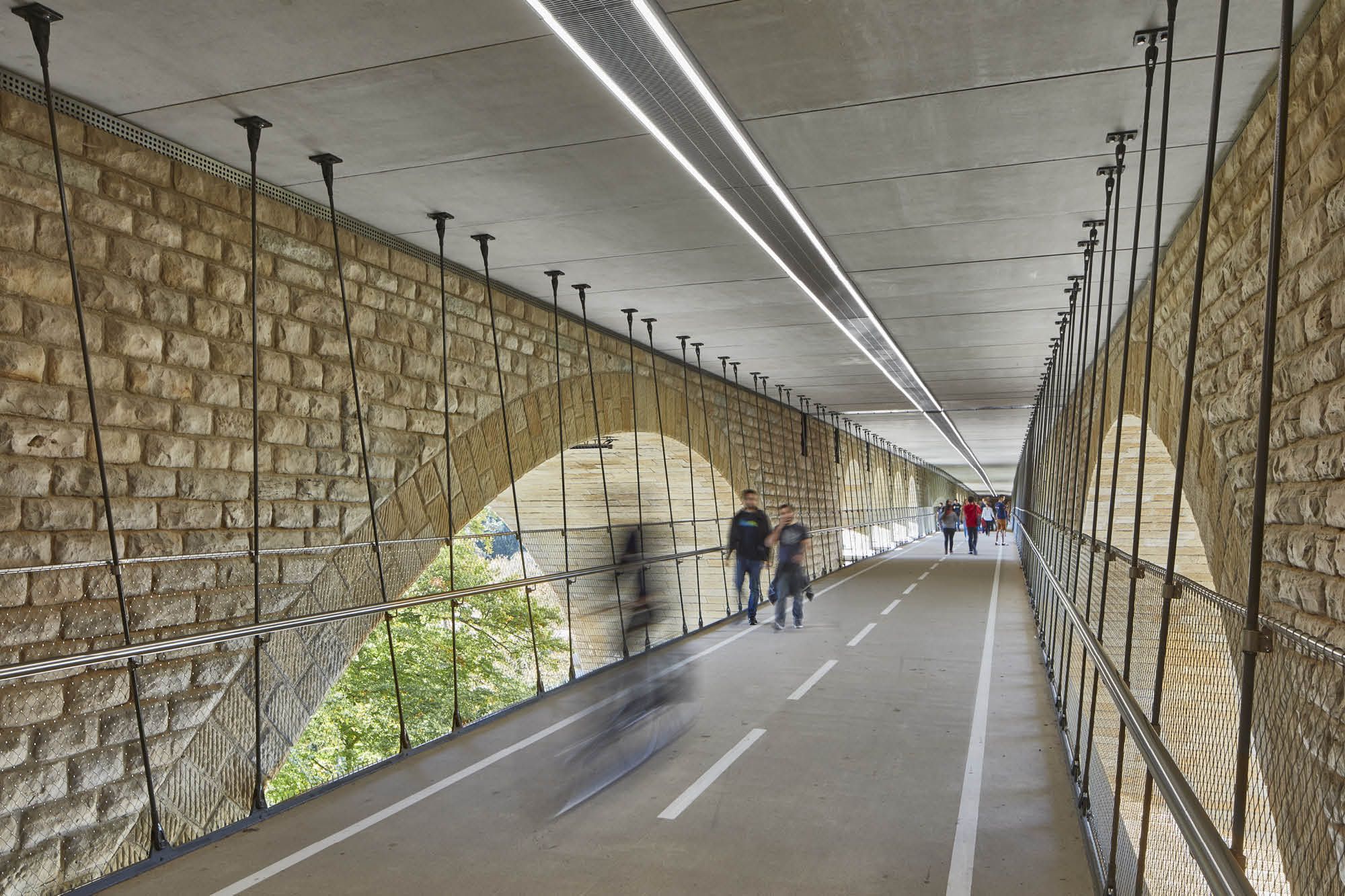 Le pont Adolphe relie deux quartiers importants de Luxembourg-Ville, la ville haute et le quartier de la gare. Le pont, en service depuis 1903, a subi des dégâts par le trafic dense l’empruntant. A l’occasion des grands travaux de rénovation et de réhabilitation, le tablier du pont a été élargi pour ajouter deux voies destinées au tram. Combiner une piste cyclable avec les trottoirs aurait demandé de rehausser les balustrades existantes. Ce qui aurait modifié trop l’aspect de l’ouvrage dans ce site classé patrimoine mondiale de l’Unesco. La solution consistait en une passerelle suspendue entre les deux arcs en dessous du Pont Adolphe.