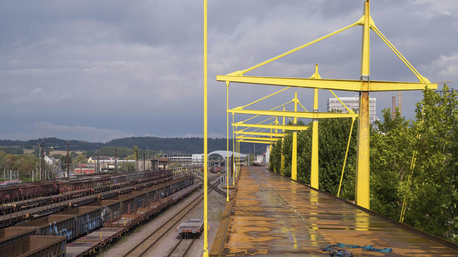 Entre les axes 25 et 39, le système statique est modifié tout en gardant l’aspect bi-poutre du tablier. La présence d’arbres à conserver le long des voies ferrées a nécessité la conception d’une partie suspendue.