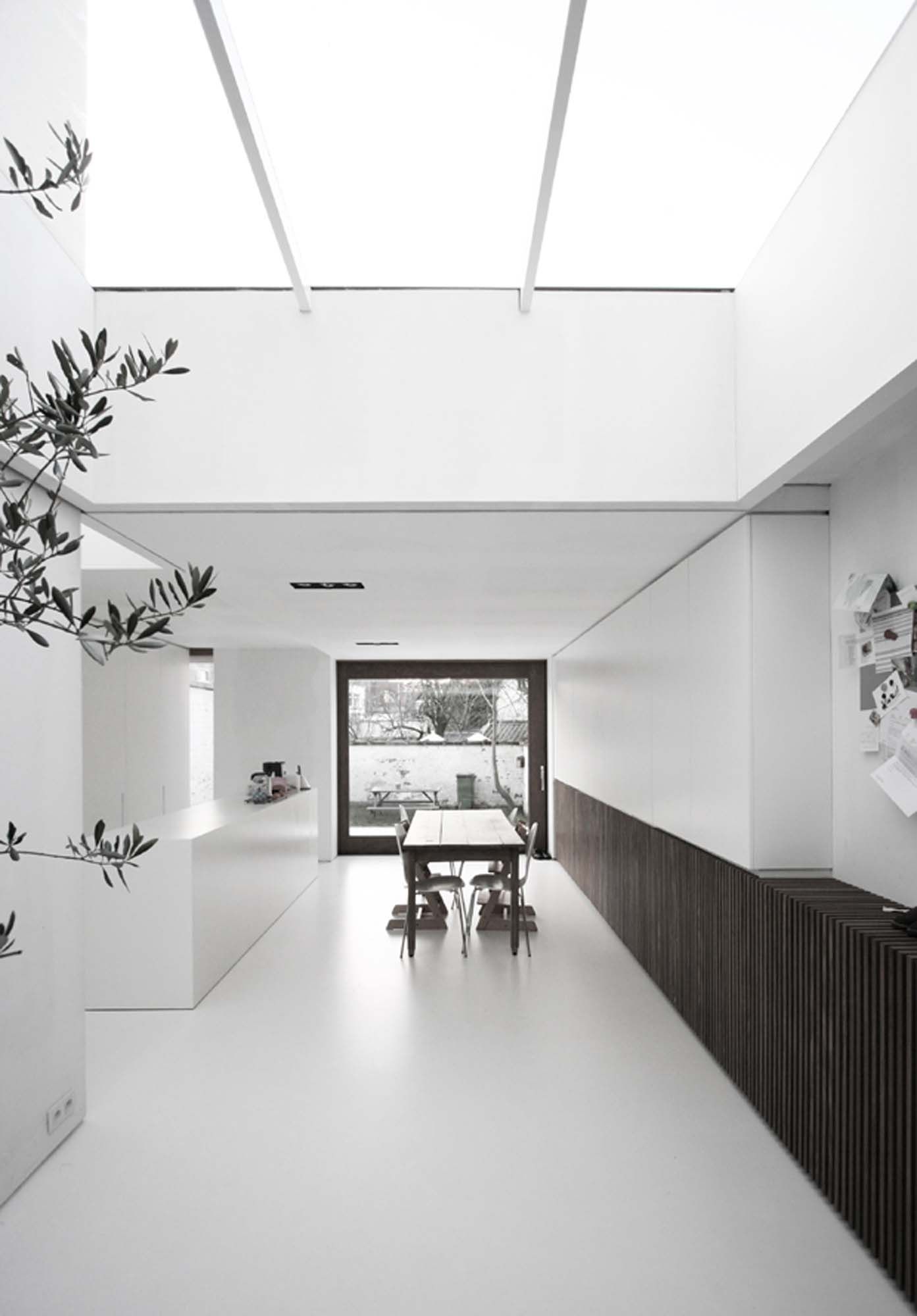 La construction arrière d’une habitation datant de l’entre-deux-guerres ne correspondait plus aux attentes du maître d’ouvrage, pas plus qu’aux exigences du confort moderne. L’idée de base de cette transformation était de créer une pièce polyvalente comportant le plus de relations possible et donnant une impression d’espace maximal. La structure en acier présente dans le volume arrière a permis une réalisation complètement nouvelle dans la zone arrière. Le squelette en acier a dans ce cas été complété par une structure en bois pour les parois et le toit. Le toit a été pourvu de deux cadres horizontaux. Ceux-ci permettent à la lumière de pénétrer profondément dans l’habitation existante et donnent chacun une vue différente sur la façade arrière. Le fait d’étendre l’utilisation des matériaux et des couleurs vers l’extérieur a permis de créer une unité d’ensemble qui renforce la relation avec l’extérieur. À l’intérieur, le choix a été fait de dissimuler les parties cuisine et lessive dans des armoires, une manière d’utiliser le nouvel espace pour mettre les diverses activités à l’avant-plan tout en se plaçant soi-même en retrait.