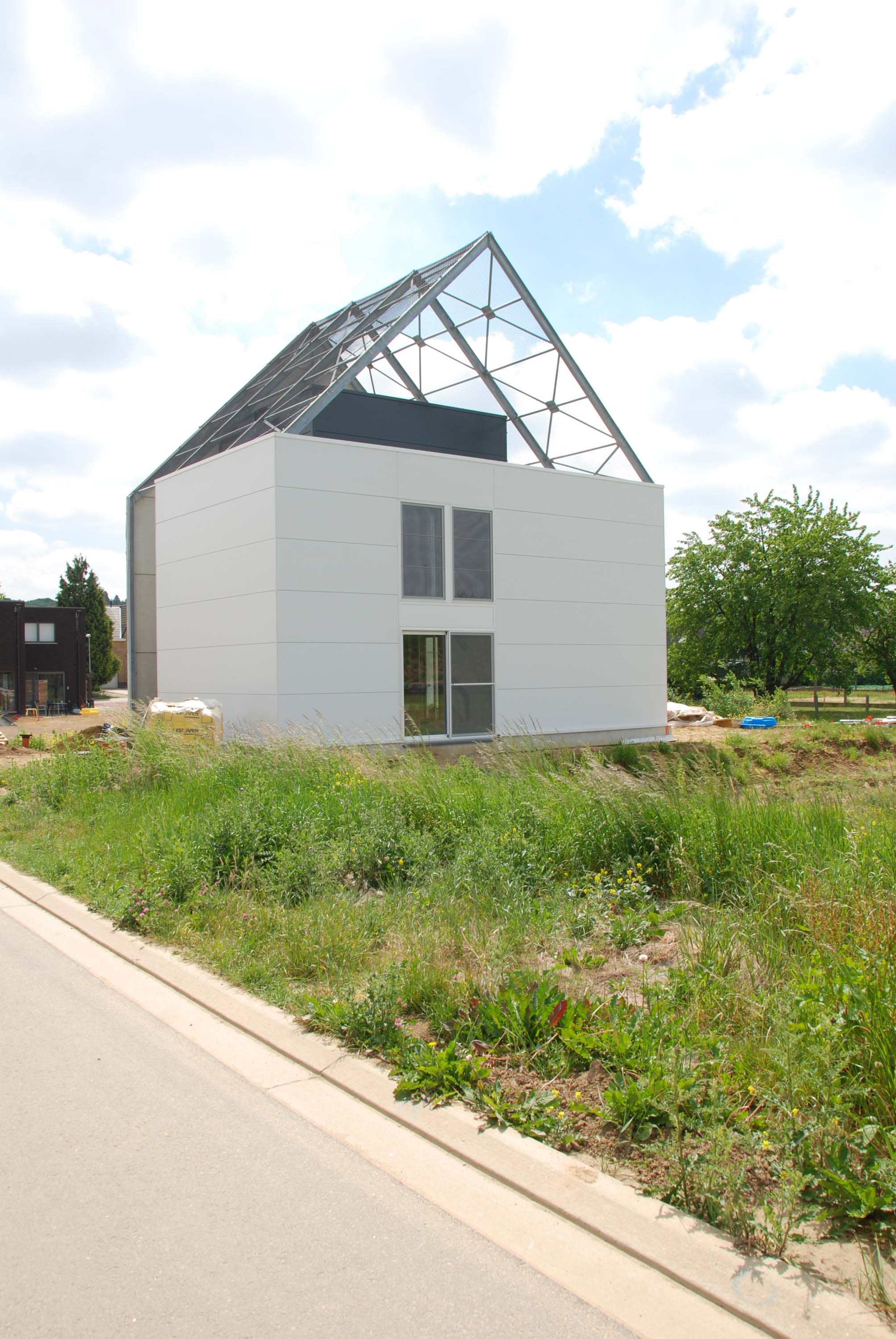 Deze woning is volledig opgebouwd als een stalen skelet met betonnen vloerplaten. Voor extra stijfheid zijn er in de staalstructuur op regelmatige plaatsen windverbanden voorzien. De gevels zijn vervolgens ingevuld met witte gevelpanelen.