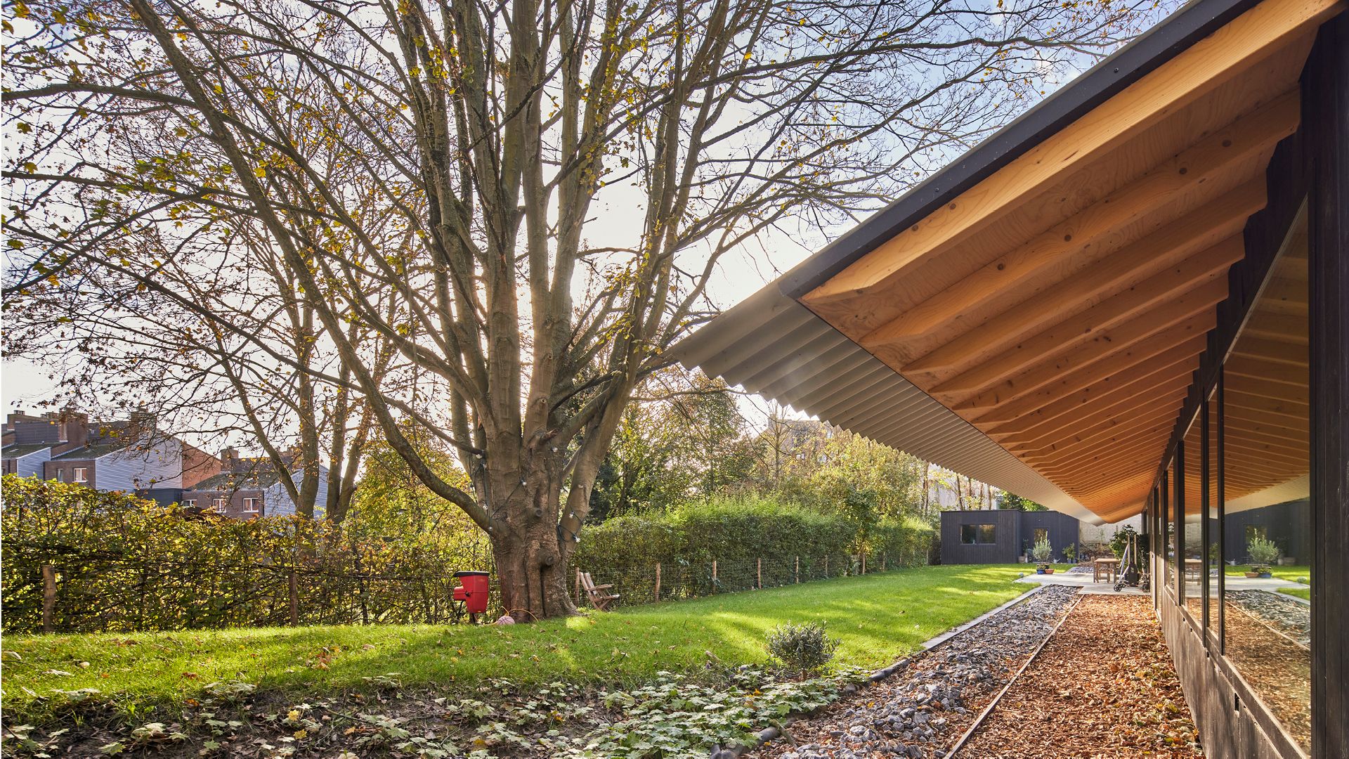 Au sommet d'une colline en région de Louvain se trouve une parcelle étrange. La topographie est énorme. Un jeune couple souhaite y construire une maison unifamiliale. Sur la parcelle arrière, ils voient apparaître une habitation basse, à un étage, avec un toit en acier légèrement incliné. La maison est entourée de verdure. La maison elle-même est essentiellement simple : des pièces donnant sur le jardin d'un côté avec de grandes fenêtres. En même temps, il y a deux lucarnes dans le toit en acier, dans l'espace de vie, elles s'accrochent à la lumière de l'ouest, dans les chambres des enfants, elles forment une plate-forme de sommeil entre les arbres.