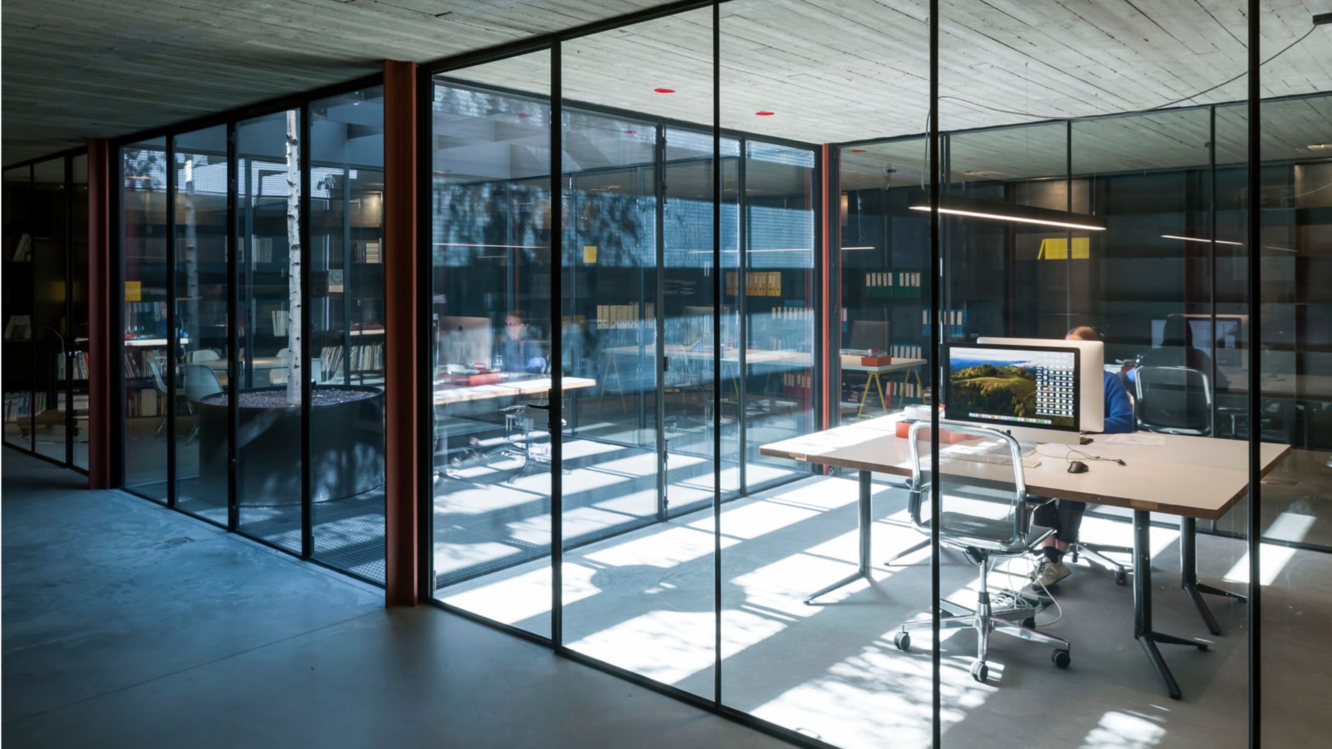 Les accents en acier, associés aux éléments en béton, définissent fortement l'atmosphère de chaque étage