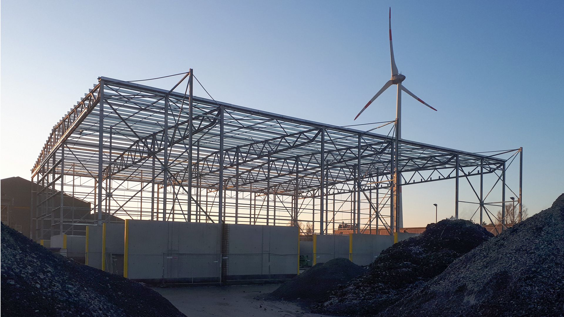 Couverture d'un entrepôt de matières premières à Menin était, en raison de ses dimensions (18 m de haut, 165 m de long et 100 m de large avec de grandes portées allant jusqu'à près de 47 m) et de sa forme (2 façades inclinées/ondulées), un défi pour la stabilité, l'assemblage et le travail de dessin. Ici, l'acier était la solution idéale pour concevoir un bâtiment élancé, alléger et peu coûteux, à partir d'un mur de soutènement en béton. Une solution avec des fermes à treillis a été trouvée.