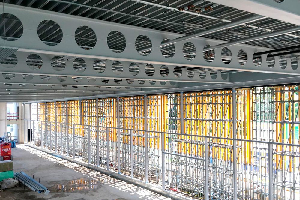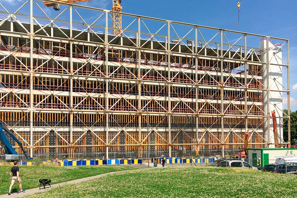 L’infrastructure polyvalente offre environ 8’000 m² d’espaces répartis sur 7 niveaux dont les planchers, supportés par des poutres alvéolaires de 15 mètres de portées, sont ponctuellement connectées, de part et d’autre, par un exosquelette en acier et des colonnes extérieures en béton.
