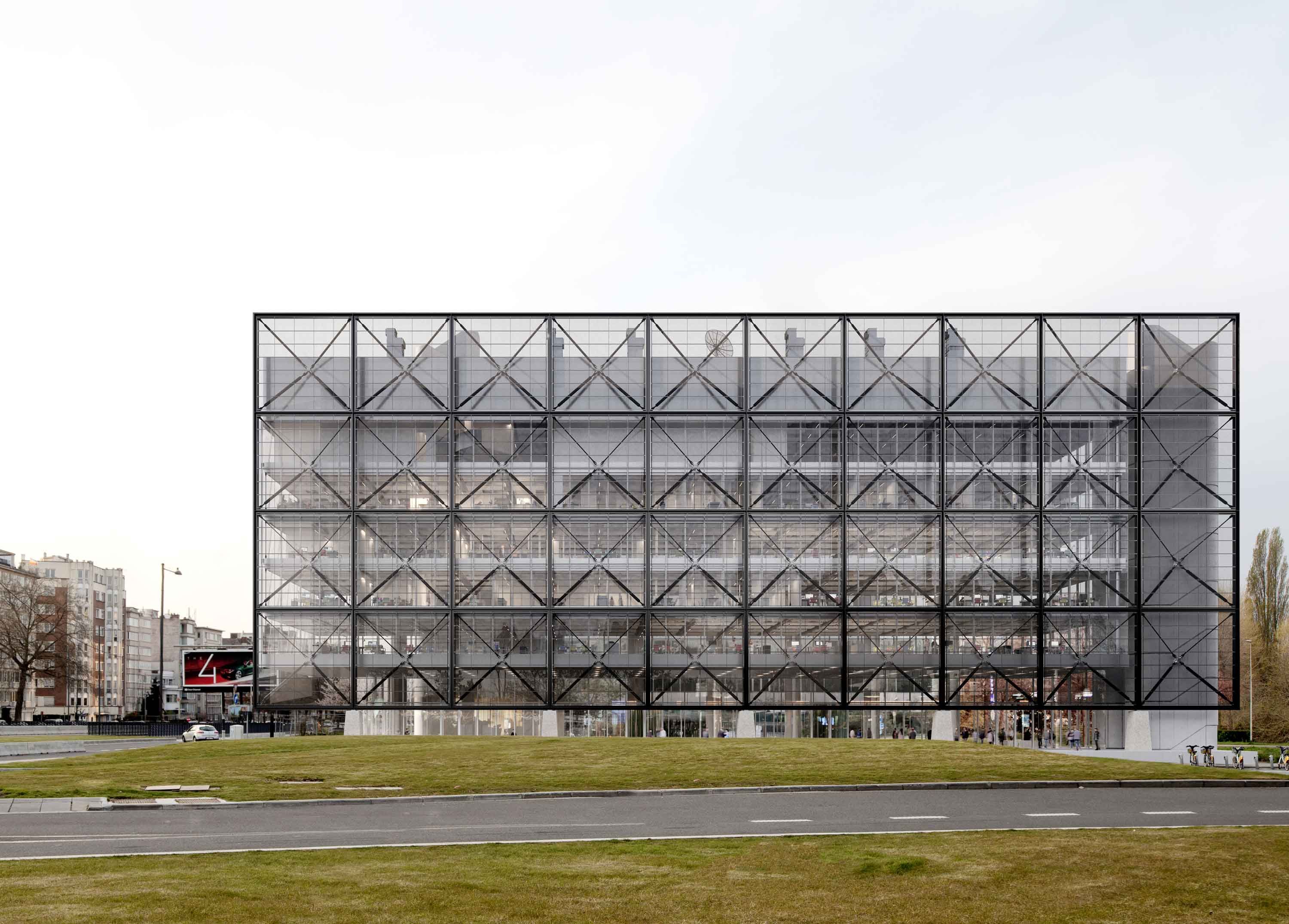 Une enveloppe entièrement vitrée laisse entrevoir l’ensemble de la charpente du bâtiment et génère une transparence et une ouverture maximale sur la ville et le mediapark.brussels dont il fait la vitrine.
