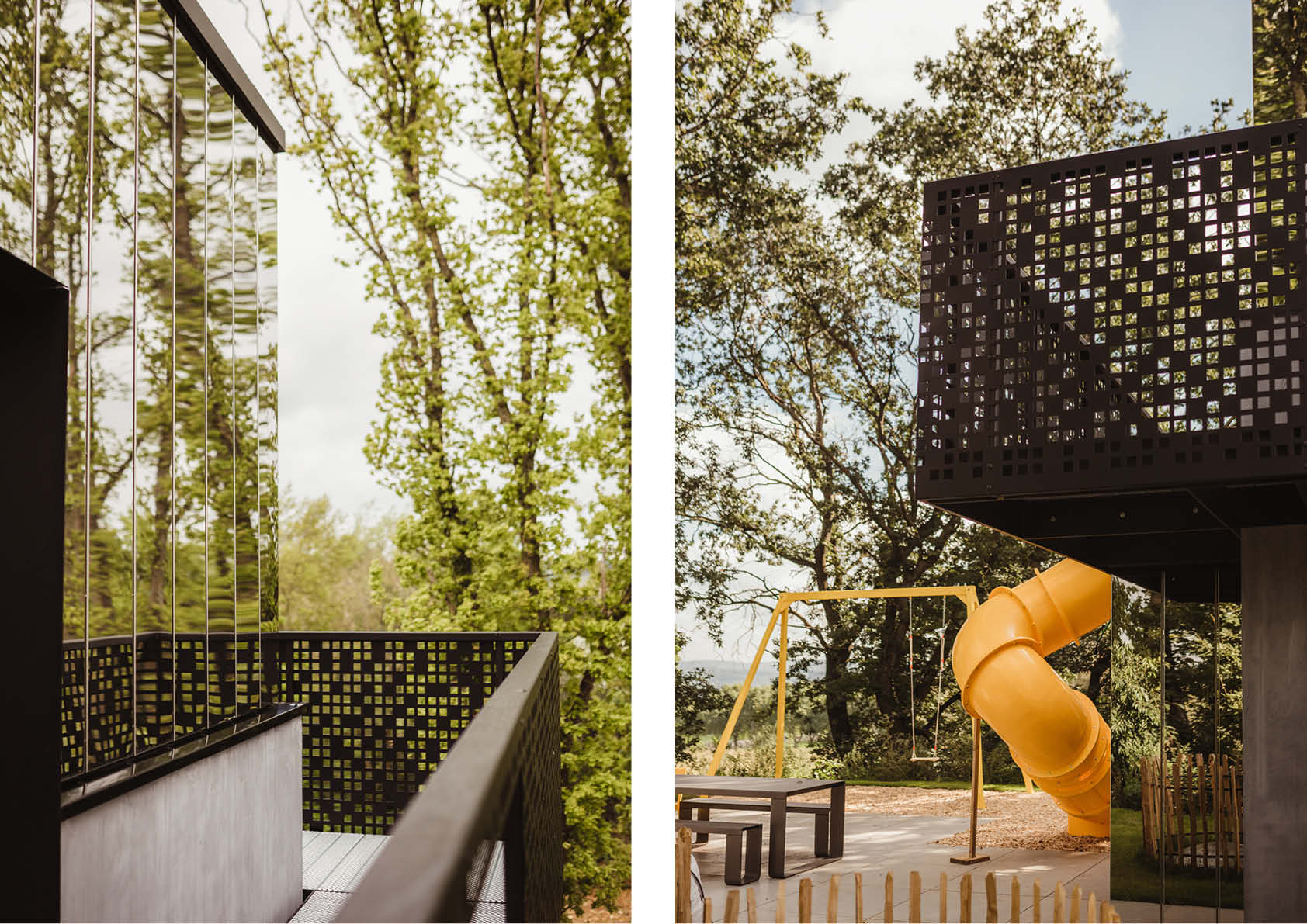 De bouwheer wilde een bescheiden oude watertoren omtoveren tot een bijzondere vakantiewoning. Het oorspronkelijke betonnen gebouw werd uitgebreid en uitgerust met een nieuwe verdieping. De gevels van die nieuwe verdieping zijn afgewerkt met een indrukwekkende ‘spiegelbekleding’, die de buitenomgeving reflecteert. De gevelbekleding bestaat uit op maat gemaakte cassettes van supergepolijste 304-inoxplaten, een keuze die zowel duurzaam als esthetisch verantwoord is. In het oorspronkelijke gebouw waren de ruimtes alleen verbonden door binnenladders en -luiken. De renovatie omvatte bijgevolg ook de installatie van een buitentrap om de circulatie te vergemakkelijken. De borstwering, die vervaardigd is uit S235-staal, werd op maat ontworpen met een pixelvormig design dat de interactie met de omringende natuur extra versterkt.