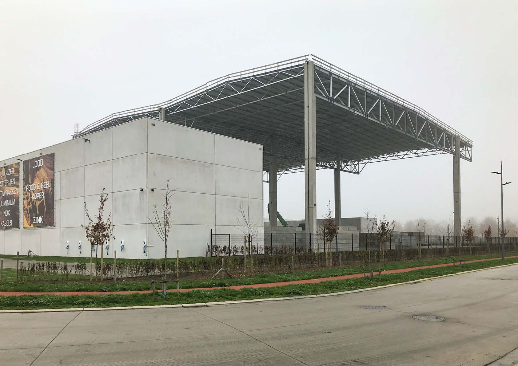 Een stalen luifel, steunend op 6 betonnen kolommen, overdekt de twee circulatieassen en is de eyecatcher van het ontwerp. Het project heeft een industriële uitstraling met een paar speelse elementen.